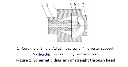 తల సాధారణంగా హెడ్ బాడీ, డైవర్టర్, డైవర్టర్ సపోర్ట్, అడ్జెస్ట్ స్క్రూ, కోర్ డై, డై లిప్, మొదలైన వాటి రకాలను కలిగి ఉంటుంది.పైపు వెలికితీత తలసాధారణంగా నేరుగా రకం, లంబ కోణం రకం, అసాధారణ రకం, స్పైరల్ రకం మరియు స్క్రీన్ బాస్కెట్ రకం ద్వారా విభజించబడ్డాయి. స్ట్రెయిట్ త్రూ హెడ్ అనేది సర్వసాధారణంగా ఉపయోగించబడుతుంది మరియు దాని నిర్మాణం మూర్తి 1లో చూపబడింది. తలను క్రింది మూడు భాగాలుగా విభజించవచ్చు: హెడ్ బాడీ మరియు డైవర్టర్ అనేది తల యొక్క మొదటి భాగాన్ని కలిగి ఉంటుంది, అంటే ప్రీఫార్మ్ విభాగం; డైవర్టర్ సపోర్ట్, డై మరియు కోర్ యొక్క కంప్రెషన్ విభాగం తల యొక్క రెండవ భాగాన్ని ఏర్పరుస్తుంది, అంటే కుదింపు విభాగం; డై మరియు కోర్ యొక్క స్ట్రెయిట్ విభాగాలు తల యొక్క మూడవ భాగాన్ని ఏర్పరుస్తాయి, అనగా ఏర్పడే విభాగం.